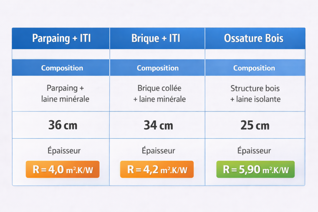 En se plaçant entres les montants, l’isolation est généralement conséquente ce qui aide a la performance globale du projet. Si bien traités, les ponts thermiques sont faibles, et le chantier est rapide a mettre en oeuvre. L’épaisseur du mur est 30% mois importante qu’un mur maçonné. Le problème majeur est le manque d’inertie, pouvant entrainant un mauvais confort d’été (DH a contrôler). Ce système constructif étant très sensible a l’humidité, la mise en oeuvre doit être irréprochable.